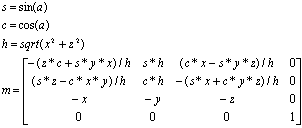 This macro performs an alignment process (in which the arbitrary axis represented by the line passing through the origin and a point (x, y, z) is rotated so it points in the same direction as the negative Z axis), and then returns a modeling matrix to the structure indicated by m for use in rotating by an angle of a degrees in the positive direction around this arbitrary axis. The result of calling this macro is the creation of a modeling matrix like the one shown below. Note that a unit matrix is returned when h = 0.