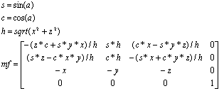 This macro performs an alignment process (in which the arbitrary axis represented by the line passing through the origin and a point (x, y, z) is rotated so it points in the same direction as the negative Z axis), and then returns a modeling matrix to the structure indicated by mf for use in rotating by an angle of a degrees in the positive direction around this arbitrary axis. The result of calling this macro is the creation of a modeling matrix like the one shown below. Note that a unit matrix is returned when h = 0.