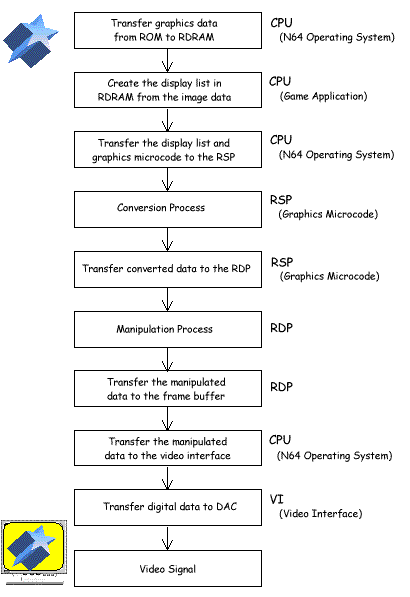 Next, the RSP provides the geometry conversion by calculating the coordinate transformation by using the appropriate microcode. After that, the RDP processes, rasterizes (Creates the pixels for the drawing), and transfers the data to the frame buffer in RDRAM. The CPU then transfers the data to the VI (Video Interface).