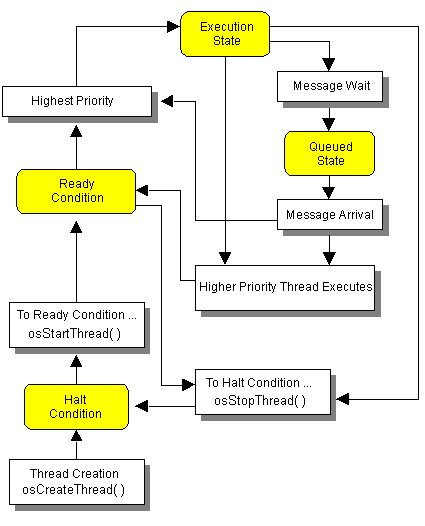 A thread in the halt condition has no standing in the execution schedule. That is, a halted thread does not automatically become a candidate for execution unless the program specifically places it in the ready condition. For example, a newly created thread is automatically placed in the halt condition. A thread can change anytime to the halt condition and the ready condition. Use the osStartThread() function to place a thread in halt condition. Use the osStopThread() function to place a thread in the ready condition