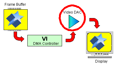 The video DAC is a piece of hardware that actually outputs the displayable video signal on the TV monitor by converting the digital data transferred from the VI into analog data that can be viewed on the screen.