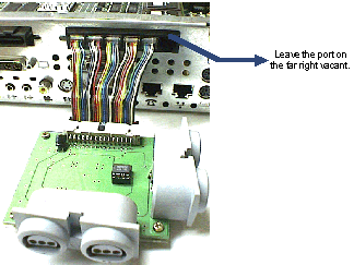 Insert the N64 Controller conversion adapter into the game controller port of the N64 emulator board. Insert the connector of the game controller port from left to right (viewed from the back of the Indy workstation) so that the cables do not crisscross. (The following figure is the way it should look, with the right-most modular connector vacant as viewed from the back.)