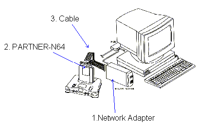 Connect the 40-pin connector of the network adapter with the I/F connector (40-pin) of PARTNER-N64 using the specialized cable for the network adapter.