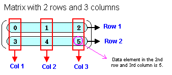 A matrix is made up of rows and columns. Rows are numbered from top to bottom, and columns are numbered from left to right. A matrix that has m rows and n columns is called a matrix of m rows and n columns or an, m x n ,matrix. An individual cell in a matrix is called an element or component and is referenced as the element in row