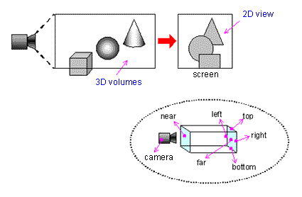 A perspective projection shows the view volume (the portion of a 3D space that a camera can capture in a picture) as a quadrilateral pyramid to give the view volume perspective. Here is an example: