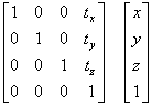 The translation matrix is used to translate; it translates the coordinates of an object to move it to a new location. When you multiply this matrix by a vector and expand it, you get the following result: