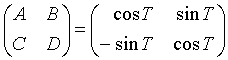 Each vertex of the sprite is also moved by this process, and the sprite is drawn in the rectangular area according to the moved vertices. If the rotation matrix is set as follows for the 2D matrix elements A, B, C, and D, the sprite will rotate by T.
