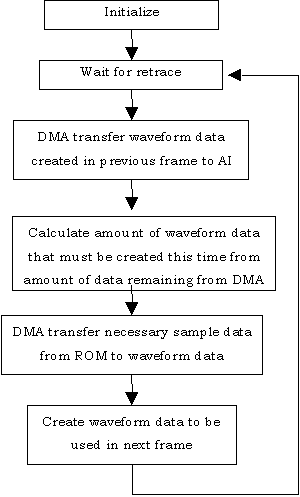 The flow is thus as follows: at every retrace the necessary samples are prepared in RAM with DMA transfers from ROM, then the audio data is synthesized by the CPU and the RSP, and finally the waveform data created in RAM is DMA transferred to the AI in order to playback audio.