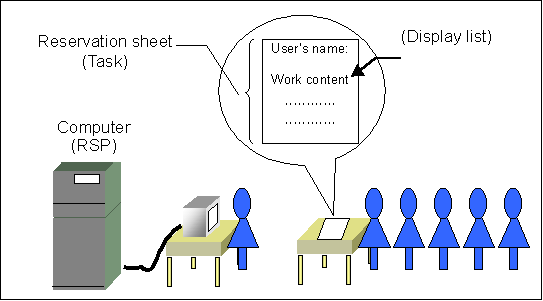 Assume that a certain company has only one extremely fast computer(think of this as a work station). This computer is not connected to a network, so only one person can use it at a time. People who want to use the computer must write their "name" and the "work description" on a "reservation sheet" and then submit this to the manager. When a person's turn comes, they can use the computer until their work is completed.